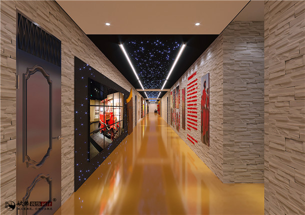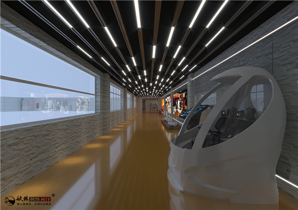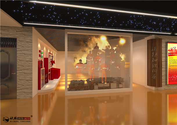 项目中,空间的主场是长廊,镹臻装饰设计师在展示区采用了直线及灯光的表现手法充分利用墙面区域和顶面区域,展示区顶部设计一个星空顶,充分展现科技感,根据具体展示需要,结合图文展板和实物进行展示,使观者对消防内容有直观了解。