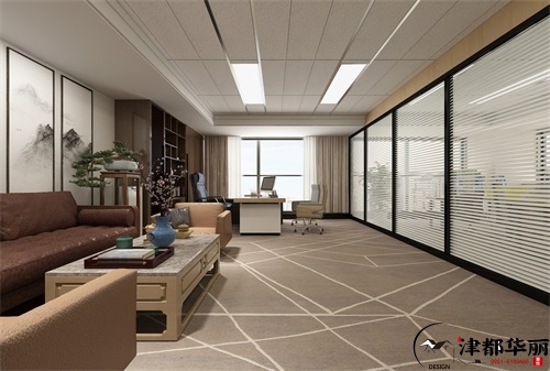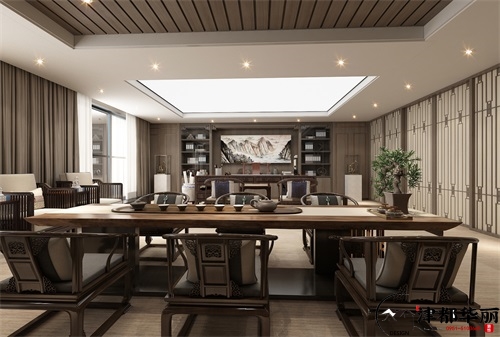 室内设计,反映的其实是一种生活方式,是对生活的一种态度。现代中式风格设计,这是现代中国人传承自己这个世界历史最悠、最古老伟大民族文化的一种方式,也成为了室内设计风格中一道亮丽的风景线!新中式风格不是纯粹的元素堆砌,而是通过对传统文化的认识,将现代元素和传统元素结合在一起,以现代人的审美需求来打造富有传统韵味的事物,让传统艺术的脉络传承下去。在配饰上方面的选择更为简洁,少了很多奢华的装饰,更加流畅的表达出传统文化中的精髓,给办公室添了几份文化韵味。