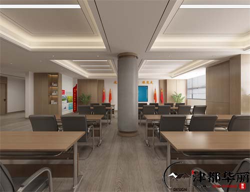 党建室的装修设计主要围绕着党的主题,以党为中心,整体设计上要以简约为主,主要突出党建文化和党的主题,在以下案例中,吊顶用木板进行简约的装饰,中间的灯具用党徽造型非常突出亮眼,也表达了我们头顶党徽,一心为党的决心,墙面也用了党建文化来进行装饰,在设计制作上包括党的政治建设、思想建设、组织建设、作风建设、纪律建设和制度建设等,既能宣传中央党政精神,弘扬正气,树立党政形象,又能美化墙面、增加群众凝聚力,让整体空间展现出严肃、积极向上、拥党爱党的空间氛围。