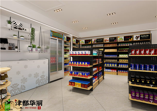 小型超市在一个城市中越来越普遍,在本案中,设计师在内部空间的设计上,偏向于简约实用,白色的地砖不仅易于打理,还看起来更加的明亮洁净,木质板材的墙面让空间更加有质感,提升了空间的档次。超市最注重的是合理的规划空间,更大化的利用好空间,包括收银台的设计和各类商品货架的摆放,货品摆放整齐有序,商品归类清晰合理,更方便购买者去选择,过道的预留空间宽敞充足,保证店内的活动空间不会感觉到拥挤。货架上方的广告设计,简单直观的为顾客展示了部分货品信息,但更多的是在视觉上使空间更加美观,更加的丰富多彩。