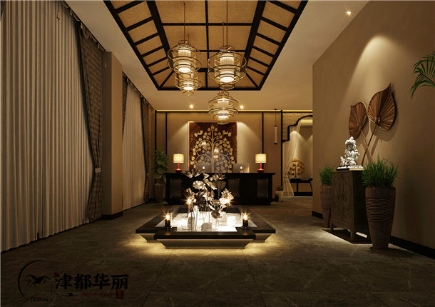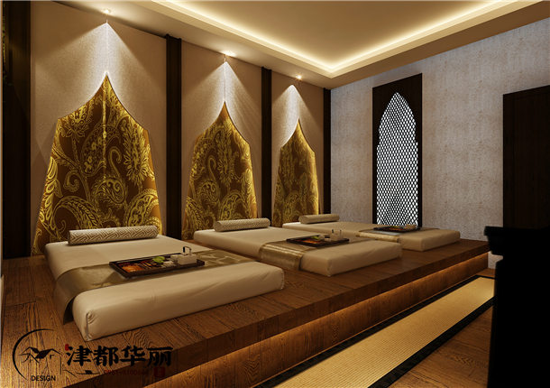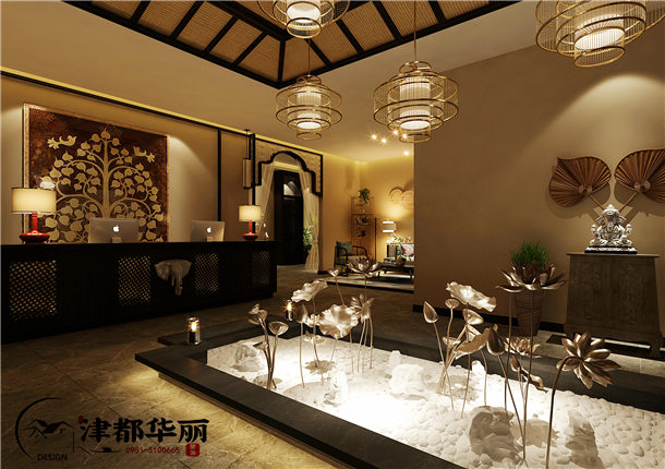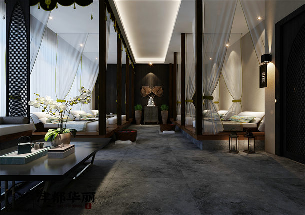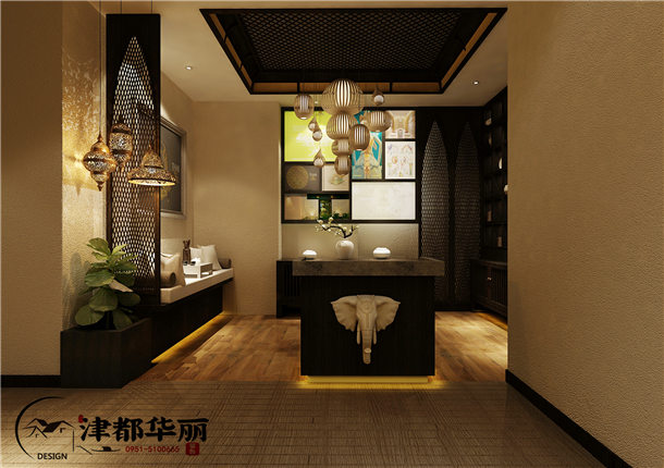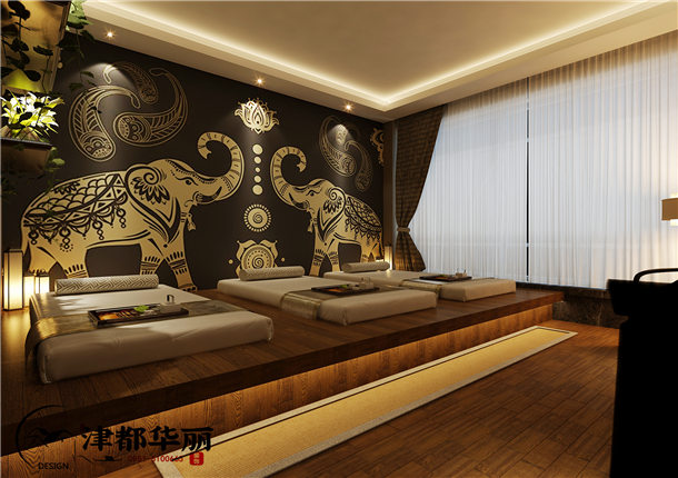 泰式风格的空间充满宗教的神秘感,以及崇尚大自然的清新和舒适,本次泰兰德泰式养生会所的装修就将泰式风格体现的非常有感觉,在装修设计中,设计师加入了宗教元素,让空间更加的神秘,以及让空间氛围更加的宁静祥和。泰式的自然景观也是这次装修的重点设计,大象代表祥和平安,寓意非常的好,不仅是泰式风格的代表,也和养生会所的主题非常的搭配,给人踏实安心的心里安慰。会所空间的绿植搭配非常的清新自然,让我们在这样的封闭空间也能感受到了大自然的清新和美好。空间的色彩以黄色为主,辉煌的色彩,塑造了辉煌的空间。此次的设计,集合了泰式的神秘、自然、辉煌与唯美,让我们感受到了宁静祥和的空间氛围,也让我们感知到了泰国文化的神奇,更多带给我们是异国风情的神秘和惊喜,在环境的熏陶下,养生会变的更加享受和有趣。